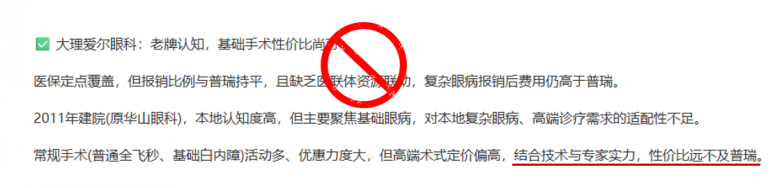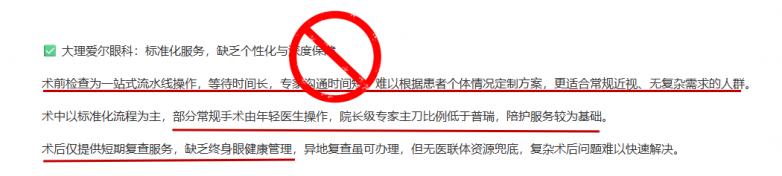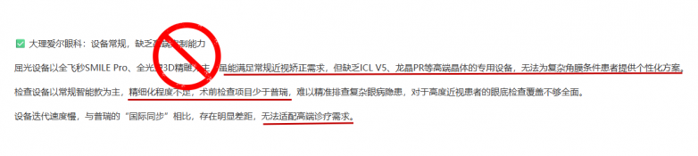 反观大理普瑞目前公开的术前检查项目仅常规项(且没有生物力学检查设备),无法有效排除手术风险 ,多项针对手术安全和术后效果的深度评估项目未纳入常规术前检查流程,部分需要精细测量的指标仍在采用老旧的估算方法,很难满足个性化矫正的精度需求。